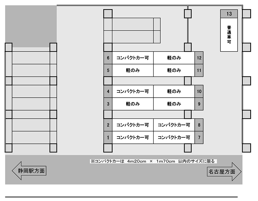 | ※No.3、5、9、10、11、12 軽自動車のみ契約可 ※No.1、2、4、6、7、8 軽自動車およびコンパクトカー契約可 ※コンパクトカーは、4m20cm × 1m70cm 以内の車に限る ※5ナンバーの車でも契約不可となる場合がありますので、事前に駐車予定の車のサイズをご確認ください。 空車情報はデータ更新時の状況です。実際に申込みをいただいた際には空き状況が変わっていることもございますので、お問い合わせ窓口までご確認ください。 |