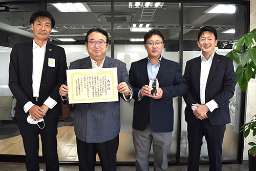 本来であれば受賞会場に赴き、表彰されるはずでしたが、コロナ禍の影響により当社にて表彰されました。