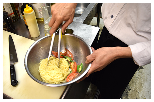 ボールで冷やし、麺の水をよく切り混ぜ合わせ