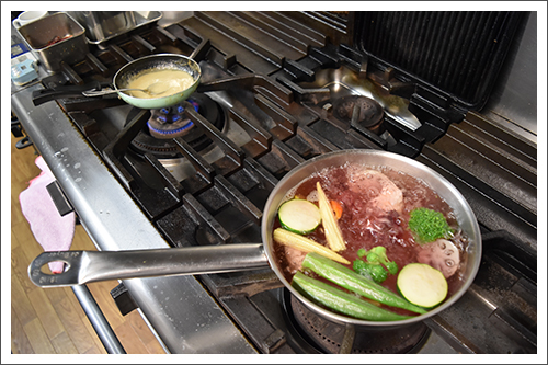 季節の野菜を茹で皿に盛り、アンチョビソースをかける。