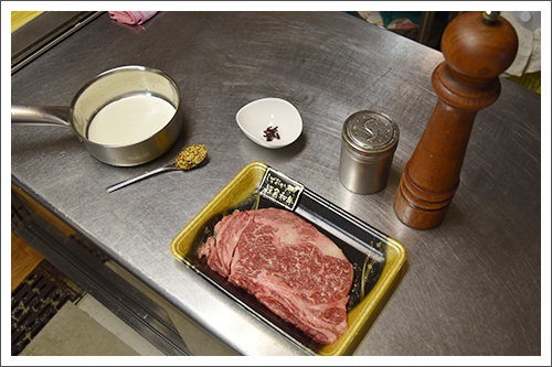 あたためたグリルパンに塩をしたステーキ肉をのせ、