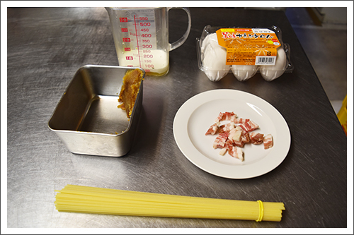 パンチェッタを鍋に入れ、ゆっくり火にかけ、