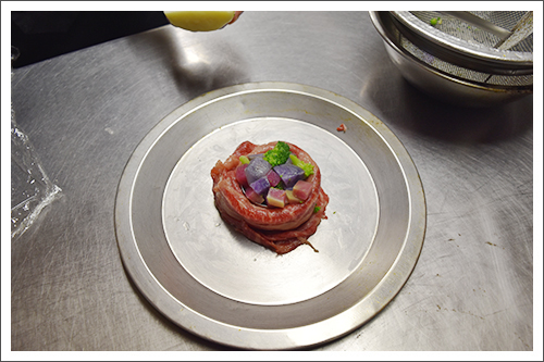 伸ばした牛ロースに下茹でした野菜を巻き、