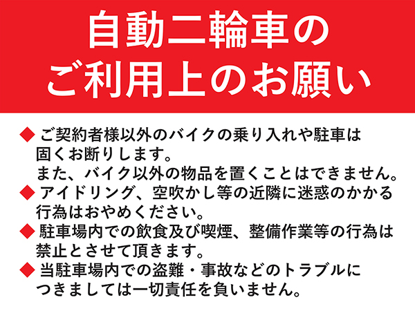 | 敷 金 | 普通 28,000円(2ヶ月分) 軽 24,000円(2ヶ月分) 自動二輪車 6,000円(2ヶ月分) |