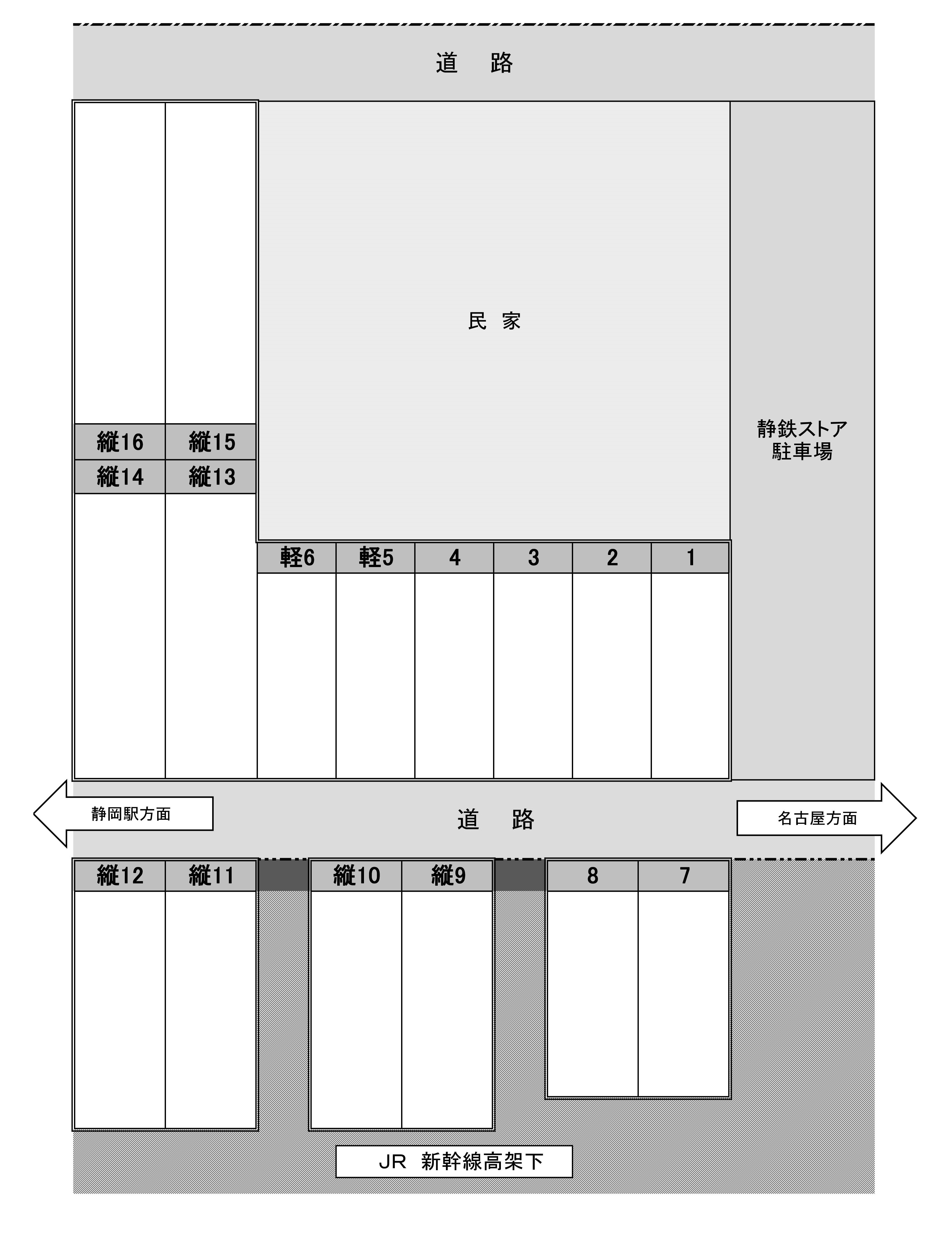 | 賃 料 | 普通(No.1~4)12,100円(税抜価格11,000円) 普通(No.7,8)13,200円(税抜価格12,000円) 軽(No.軽5,軽6)11,000円(税抜価格10,000円) 普通 縦列区画(No.縦9~No.縦12)17,600円(税抜金額16,000円) 普通車 縦列区画(No.縦13~No.縦16)16,500円(税抜金額15,000円) |