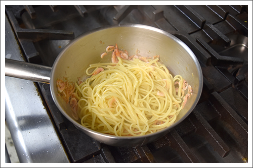 茹で上がったパスタを入れ卵黄クリームをなじませる。