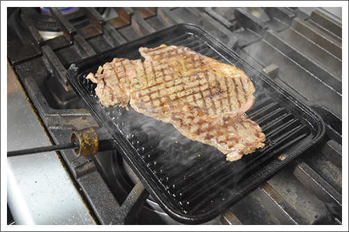 あたためたグリルパンに塩をしたステーキ肉をのせ、