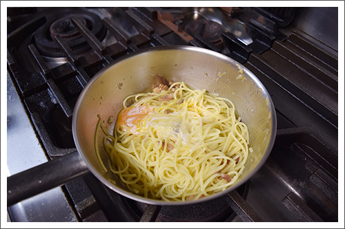 パンチェッタを鍋に入れ、ゆっくり火にかけ、