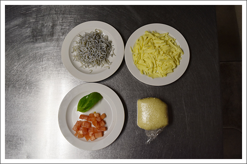 ピザ生地を薄く伸ばしチーズ、シラス、トマトを乗せ